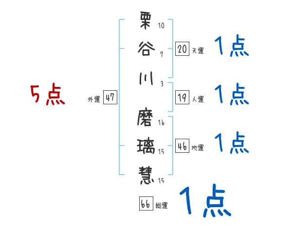 外運![]() | 栗谷川磨璃慧さんの外運は47画の5つ星!実力が開花し発展する円満な人生。財に恵まれる。 生活面を象徴する運勢です。外部から受ける影響力を表し、結婚運、家庭運や職場、環境への順応性を表します。 |