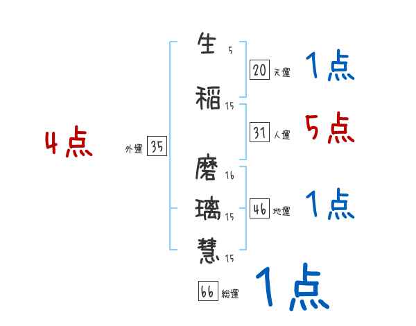 外運![]() | 生稲磨璃慧さんの外運は35画の4つ星!温厚な性格で感受性が高い。穏和な性格で人望が厚い。 生活面を象徴する運勢です。外部から受ける影響力を表し、結婚運、家庭運や職場、環境への順応性を表します。 |