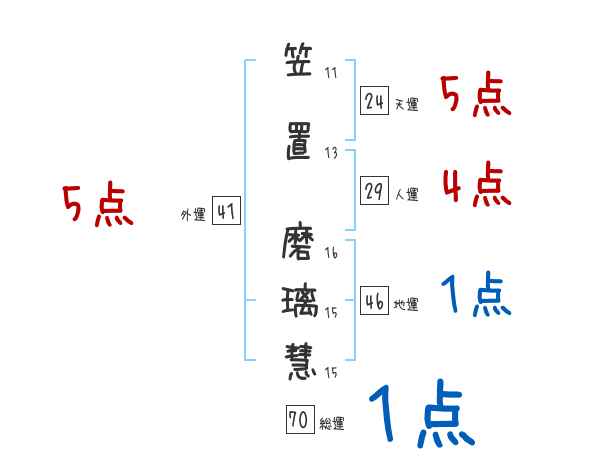 天運![]() | 笠置磨璃慧さんの天運は24画の5つ星!家庭運が良く順調な人生。金運にも恵まれる。 家系が持つ宿命的な運勢を表します。祖先から受け継いだ苗字ですので自分の力が及びません。家柄を象徴します。 |