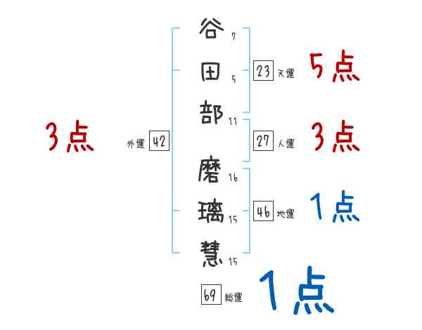 天運![]()  | 谷田部磨璃慧さんの天運は23画の5つ星!想像力に優れ活力がある。一代で成功し名誉を手に入れる。 家系が持つ宿命的な運勢を表します。祖先から受け継いだ苗字ですので自分の力が及びません。家柄を象徴します。 |
