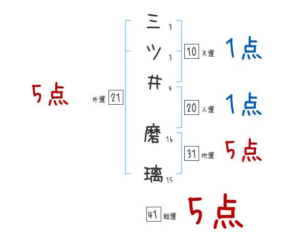 外運![]() | 三ツ井磨璃さんの外運は21画の5つ星!統率力がある。独立し成功する。名誉を手に入れる。 生活面を象徴する運勢です。外部から受ける影響力を表し、結婚運、家庭運や職場、環境への順応性を表します。 |