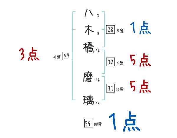 | 総運  | 八木橋磨璃さんの総運は59画の1つ星!意志の弱さであきらめることが多いかも。粘り強さが必要。あなたの人生を表す1番重要な運勢です。生涯を通じて影響する総合運となり、主に50歳以降の晩年期に影響を及ぼします。 |