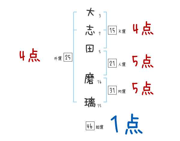 総運![]() | 大志田磨璃さんの総運は46画の1つ星!迷走することが多く苦労するかも。目先のことにとらわれないように。 あなたの人生を表す1番重要な運勢です。生涯を通じて影響する総合運となり、主に50歳以降の晩年期に影響を及ぼします。 |