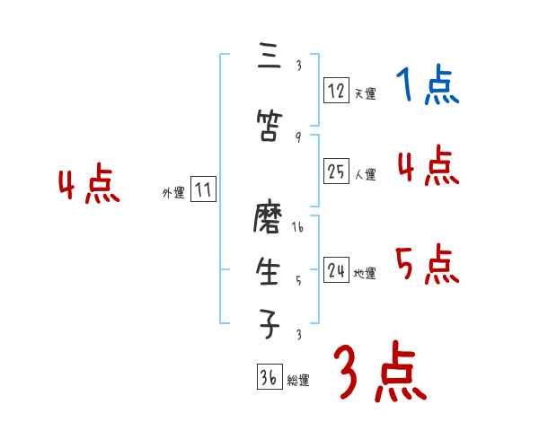 天運![]() | 三笘磨生子さんの天運は12画の1つ星!簡単な失敗で諦めてしまいやすいかも。着実に行動すると良いでしょう。 家系が持つ宿命的な運勢を表します。祖先から受け継いだ苗字ですので自分の力が及びません。家柄を象徴します。 |
