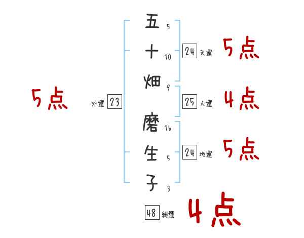 天運![]() | 五十畑磨生子さんの天運は24画の5つ星!家庭運が良く順調な人生。金運にも恵まれる。 家系が持つ宿命的な運勢を表します。祖先から受け継いだ苗字ですので自分の力が及びません。家柄を象徴します。 |