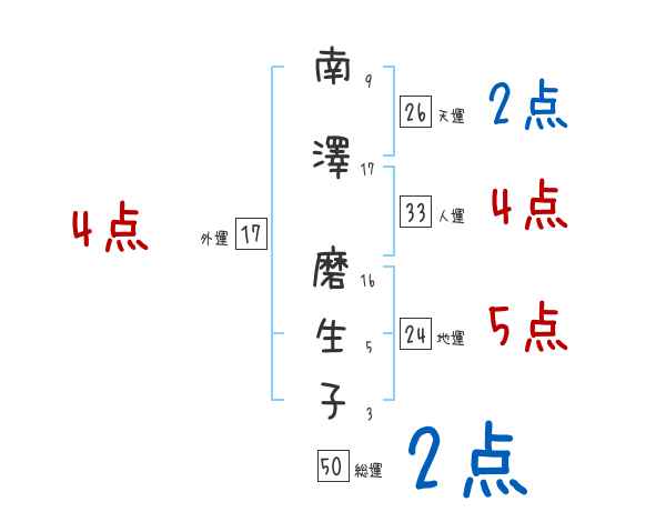 外運![]() | 南澤磨生子さんの外運は17画の4つ星!積極的な行動力。地位を気づき財産を手に入れる。純粋な心と直感力。 生活面を象徴する運勢です。外部から受ける影響力を表し、結婚運、家庭運や職場、環境への順応性を表します。 |