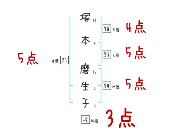 人運![]() | 塚本磨生子さんの人運は21画の5つ星!統率力がある。独立し成功する。名誉を手に入れる。 性格や才能などを表す2番目に重要な運勢です。人間関係や協調性、社会的な成功に影響します。主に20歳から50歳ぐらいまでの中年期の運勢を表します。 |
