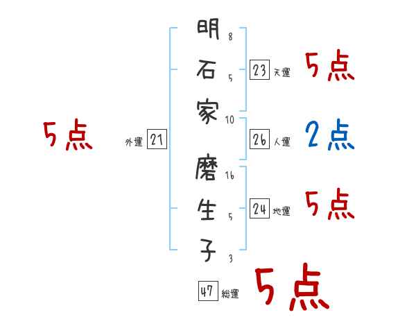 総運![]() | 明石家磨生子さんの総運は47画の5つ星!実力が開花し発展する円満な人生。財に恵まれる。 あなたの人生を表す1番重要な運勢です。生涯を通じて影響する総合運となり、主に50歳以降の晩年期に影響を及ぼします。 |