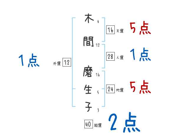 人運![]() | 木間磨生子さんの人運は28画の1つ星!家庭環境に注意。スポーツで活躍できる能力があるかも。 性格や才能などを表す2番目に重要な運勢です。人間関係や協調性、社会的な成功に影響します。主に20歳から50歳ぐらいまでの中年期の運勢を表します。 |