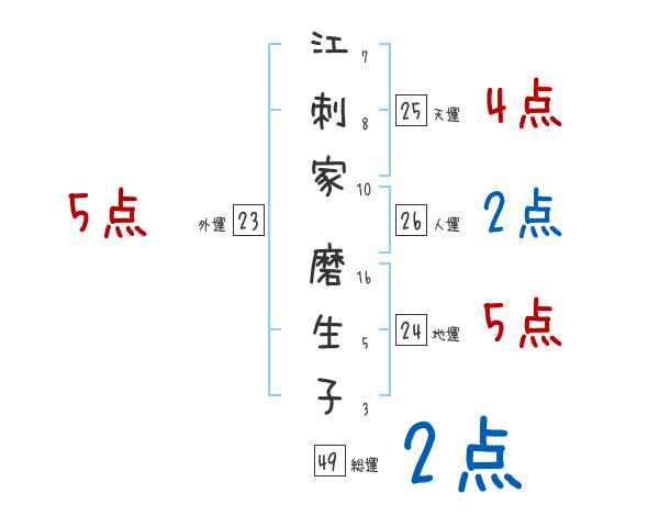 地運![]() | 江刺家磨生子さんの地運は24画の5つ星!家庭運が良く順調な人生。金運にも恵まれる。 個性を表す基礎的な運勢です。性格形成や対人関係、行動力など家庭環境に影響されます。主に誕生してから20歳くらいまでの若年期の運勢を表します。 |