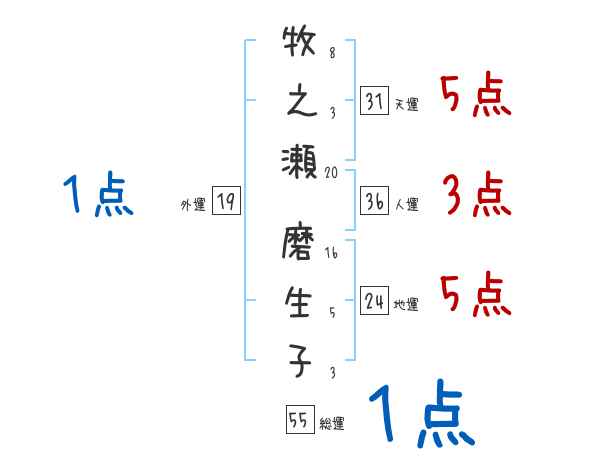 外運![]() | 牧之瀬磨生子さんの外運は19画の1つ星!優れた才能を持ちますが、協調性が足りないことも。周りの人と協力する事を意識しましょう。 生活面を象徴する運勢です。外部から受ける影響力を表し、結婚運、家庭運や職場、環境への順応性を表します。 |