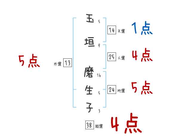 天運![]() | 玉垣磨生子さんの天運は14画の1つ星!人に対して優しいがストレスを溜め込みがち。人間関係のトラブルを避けるよう気をつけましょう。 家系が持つ宿命的な運勢を表します。祖先から受け継いだ苗字ですので自分の力が及びません。家柄を象徴します。 |