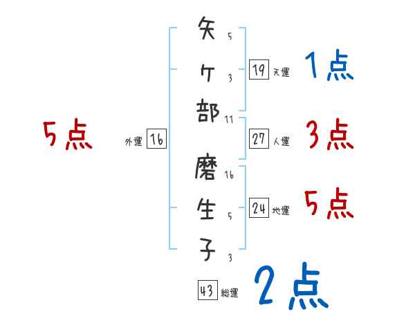 外運![]() | 矢ヶ部磨生子さんの外運は16画の5つ星!人望が厚く大きく発展する。逆転成功が見える。 生活面を象徴する運勢です。外部から受ける影響力を表し、結婚運、家庭運や職場、環境への順応性を表します。 |