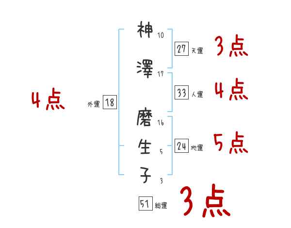 天運![]() | 神澤磨生子さんの天運は27画の3つ星!頭脳明晰だが強情で摩擦が多い傾向。孤立に注意。 家系が持つ宿命的な運勢を表します。祖先から受け継いだ苗字ですので自分の力が及びません。家柄を象徴します。 |