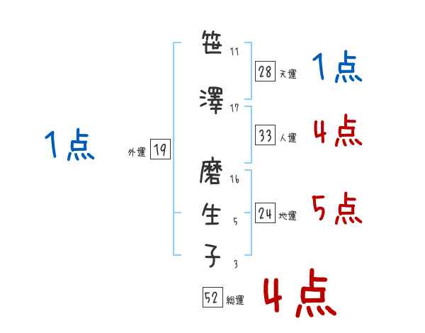 外運![]() | 笹澤磨生子さんの外運は19画の1つ星!優れた才能を持ちますが、協調性が足りないことも。周りの人と協力する事を意識しましょう。 生活面を象徴する運勢です。外部から受ける影響力を表し、結婚運、家庭運や職場、環境への順応性を表します。 |