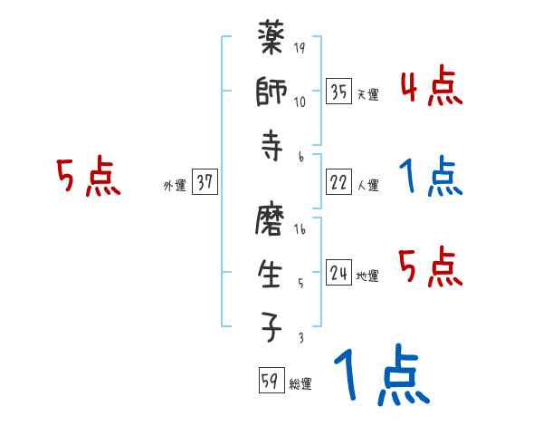 | 天運  | 薬師寺磨生子さんの天運は35画の4つ星!温厚な性格で感受性が高い。穏和な性格で人望が厚い。家系が持つ宿命的な運勢を表します。祖先から受け継いだ苗字ですので自分の力が及びません。家柄を象徴します。 |