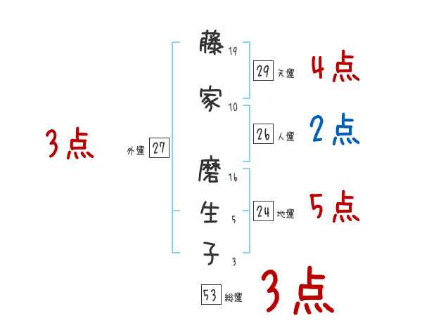 外運![]() | 藤家磨生子さんの外運は27画の3つ星!頭脳明晰だが強情で摩擦が多い傾向。孤立に注意。 生活面を象徴する運勢です。外部から受ける影響力を表し、結婚運、家庭運や職場、環境への順応性を表します。 |