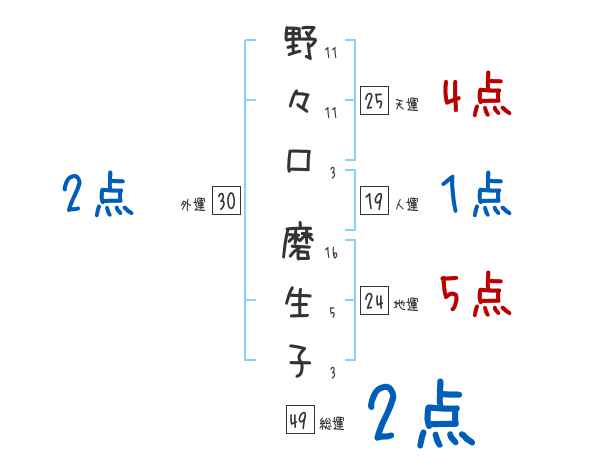 総運![]() | 野々口磨生子さんの総運は49画の2つ星!不安定な性格で明暗がある人生。周りの人には支援されやすい。 あなたの人生を表す1番重要な運勢です。生涯を通じて影響する総合運となり、主に50歳以降の晩年期に影響を及ぼします。 |