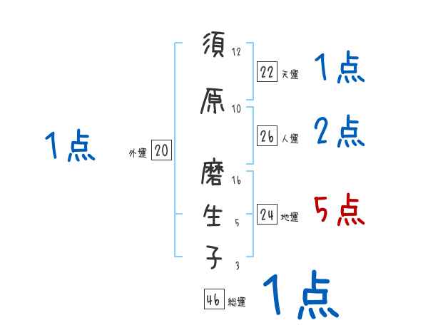 総運![]() | 須原磨生子さんの総運は46画の1つ星!迷走することが多く苦労するかも。目先のことにとらわれないように。 あなたの人生を表す1番重要な運勢です。生涯を通じて影響する総合運となり、主に50歳以降の晩年期に影響を及ぼします。 |