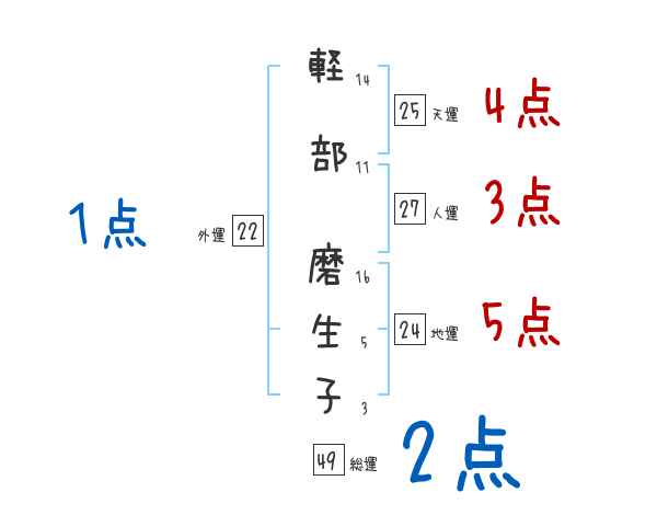 | 総運  | 軽部磨生子さんの総運は49画の2つ星!不安定な性格で明暗がある人生。周りの人には支援されやすい。あなたの人生を表す1番重要な運勢です。生涯を通じて影響する総合運となり、主に50歳以降の晩年期に影響を及ぼします。 |