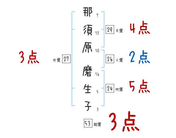 総運![]() | 那須原磨生子さんの総運は53画の3つ星!やや見栄っ張りで虚栄心がある。散財に注意。 あなたの人生を表す1番重要な運勢です。生涯を通じて影響する総合運となり、主に50歳以降の晩年期に影響を及ぼします。 |