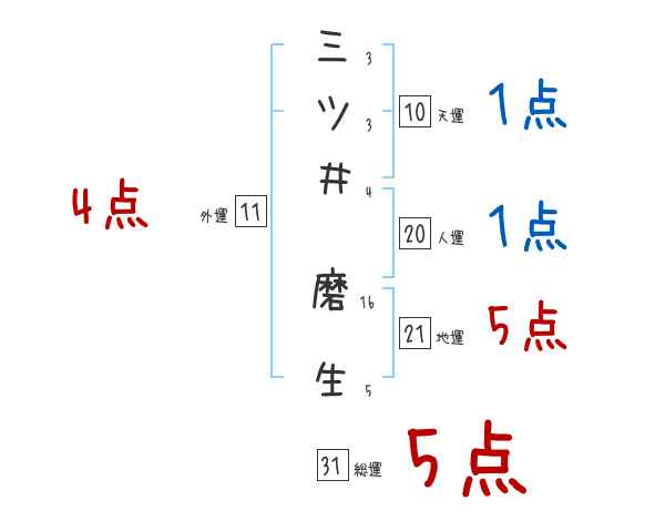 外運![]() | 三ツ井磨生さんの外運は11画の4つ星!着実に富や地位を得る幸運な人生。 生活面を象徴する運勢です。外部から受ける影響力を表し、結婚運、家庭運や職場、環境への順応性を表します。 |