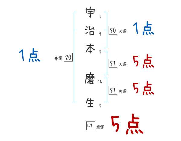 人運![]() | 宇治本磨生さんの人運は21画の5つ星!統率力がある。独立し成功する。名誉を手に入れる。 性格や才能などを表す2番目に重要な運勢です。人間関係や協調性、社会的な成功に影響します。主に20歳から50歳ぐらいまでの中年期の運勢を表します。 |