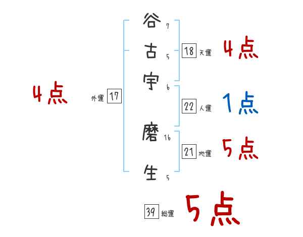 外運![]() | 谷古宇磨生さんの外運は17画の4つ星!積極的な行動力。地位を気づき財産を手に入れる。純粋な心と直感力。 生活面を象徴する運勢です。外部から受ける影響力を表し、結婚運、家庭運や職場、環境への順応性を表します。 |