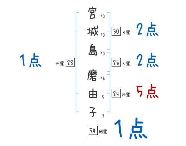 総運![]() | 宮城島磨由子さんの総運は54画の1つ星!トラブルが多いかも。周りをよく見て協調して過ごしましょう。 あなたの人生を表す1番重要な運勢です。生涯を通じて影響する総合運となり、主に50歳以降の晩年期に影響を及ぼします。 |