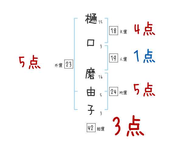 外運![]() | 樋口磨由子さんの外運は23画の5つ星!想像力に優れ活力がある。一代で成功し名誉を手に入れる。 生活面を象徴する運勢です。外部から受ける影響力を表し、結婚運、家庭運や職場、環境への順応性を表します。 |