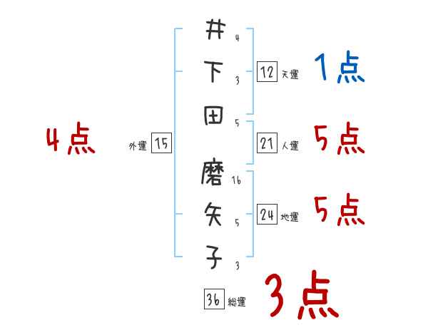 総運![]() | 井下田磨矢子さんの総運は36画の3つ星!先見性が豊かです。多少神経質で苦労することも。 あなたの人生を表す1番重要な運勢です。生涯を通じて影響する総合運となり、主に50歳以降の晩年期に影響を及ぼします。 |