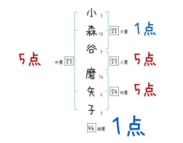 外運![]() | 小森谷磨矢子さんの外運は23画の5つ星!想像力に優れ活力がある。一代で成功し名誉を手に入れる。 生活面を象徴する運勢です。外部から受ける影響力を表し、結婚運、家庭運や職場、環境への順応性を表します。 |