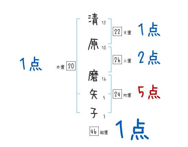 総運![]() | 清原磨矢子さんの総運は46画の1つ星!迷走することが多く苦労するかも。目先のことにとらわれないように。 あなたの人生を表す1番重要な運勢です。生涯を通じて影響する総合運となり、主に50歳以降の晩年期に影響を及ぼします。 |