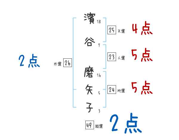 天運![]() | 濱谷磨矢子さんの天運は25画の4つ星!個性があり才能があふれる。強運の持ち主で発展する。 家系が持つ宿命的な運勢を表します。祖先から受け継いだ苗字ですので自分の力が及びません。家柄を象徴します。 |
