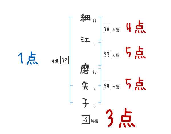 天運![]() | 細江磨矢子さんの天運は18画の4つ星!情熱的で剛気。忍耐力があり信頼される。 家系が持つ宿命的な運勢を表します。祖先から受け継いだ苗字ですので自分の力が及びません。家柄を象徴します。 |