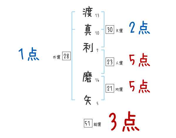 天運![]() | 渡真利磨矢さんの天運は30画の2つ星!浮き沈みの激しさに注意しましょう。 家系が持つ宿命的な運勢を表します。祖先から受け継いだ苗字ですので自分の力が及びません。家柄を象徴します。 |