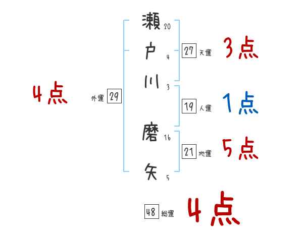 総運![]() | 瀬戸川磨矢さんの総運は48画の4つ星!賢明な性格で人望が厚い。指導力があり多くの人に尊敬される。 あなたの人生を表す1番重要な運勢です。生涯を通じて影響する総合運となり、主に50歳以降の晩年期に影響を及ぼします。 |