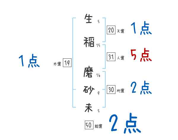外運![]() | 生稲磨砂未さんの外運は19画の1つ星!優れた才能を持ちますが、協調性が足りないことも。周りの人と協力する事を意識しましょう。 生活面を象徴する運勢です。外部から受ける影響力を表し、結婚運、家庭運や職場、環境への順応性を表します。 |