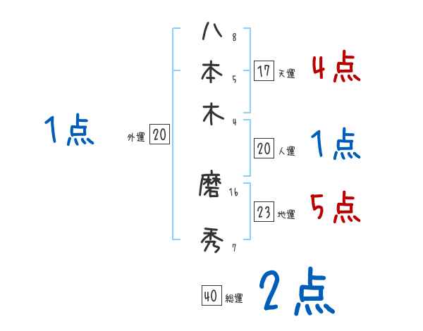 天運![]() | 八本木磨秀さんの天運は17画の4つ星!積極的な行動力。地位を気づき財産を手に入れる。純粋な心と直感力。 家系が持つ宿命的な運勢を表します。祖先から受け継いだ苗字ですので自分の力が及びません。家柄を象徴します。 |