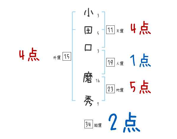 天運![]() | 小田口磨秀さんの天運は11画の4つ星!着実に富や地位を得る幸運な人生。 家系が持つ宿命的な運勢を表します。祖先から受け継いだ苗字ですので自分の力が及びません。家柄を象徴します。 |