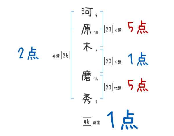 天運![]() | 河原木磨秀さんの天運は23画の5つ星!想像力に優れ活力がある。一代で成功し名誉を手に入れる。 家系が持つ宿命的な運勢を表します。祖先から受け継いだ苗字ですので自分の力が及びません。家柄を象徴します。 |