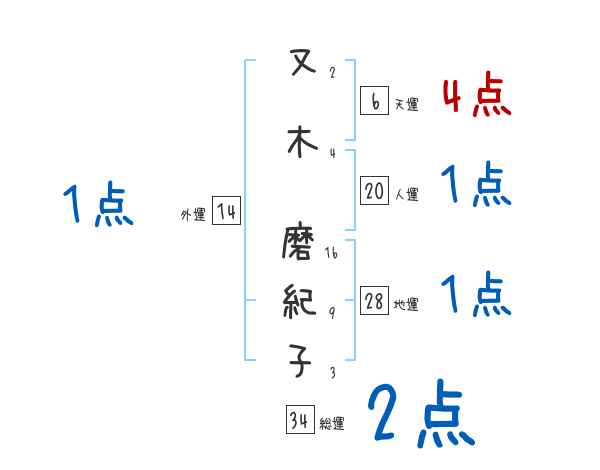 総運![]() | 又木磨紀子さんの総運は34画の2つ星!独創性に優れるが、自尊心が強く災難に注意しましょう。 あなたの人生を表す1番重要な運勢です。生涯を通じて影響する総合運となり、主に50歳以降の晩年期に影響を及ぼします。 |