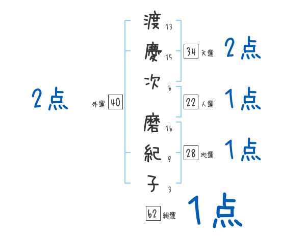 人運![]() | 渡慶次磨紀子さんの人運は22画の1つ星!努力することが苦手ないっぽう手先が器用。芸術性にも優れる。 性格や才能などを表す2番目に重要な運勢です。人間関係や協調性、社会的な成功に影響します。主に20歳から50歳ぐらいまでの中年期の運勢を表します。 |