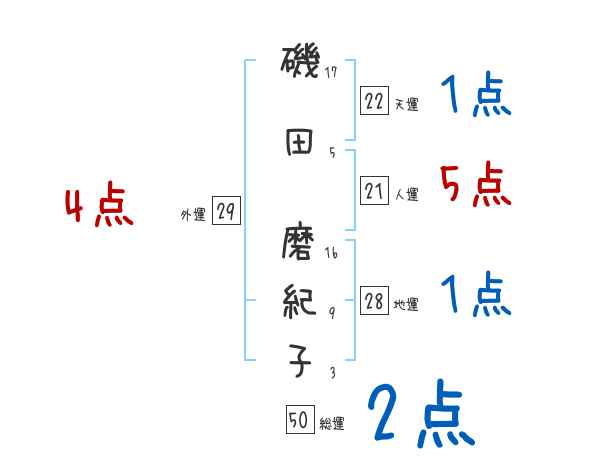 外運![]() | 磯田磨紀子さんの外運は29画の4つ星!完全主義で才能がある。厳格な心の持ち主。 生活面を象徴する運勢です。外部から受ける影響力を表し、結婚運、家庭運や職場、環境への順応性を表します。 |