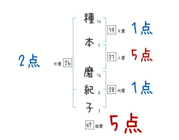 総運![]() | 種本磨紀子さんの総運は47画の5つ星!実力が開花し発展する円満な人生。財に恵まれる。 あなたの人生を表す1番重要な運勢です。生涯を通じて影響する総合運となり、主に50歳以降の晩年期に影響を及ぼします。 |