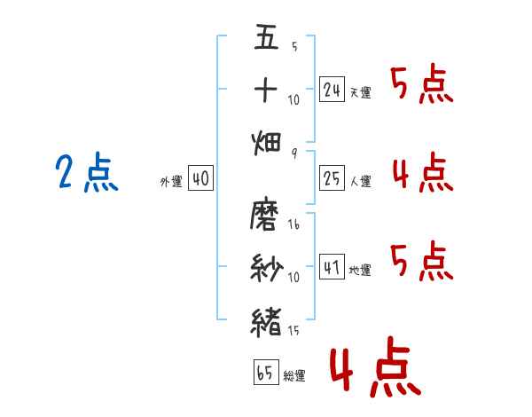 天運![]() | 五十畑磨紗緒さんの天運は24画の5つ星!家庭運が良く順調な人生。金運にも恵まれる。 家系が持つ宿命的な運勢を表します。祖先から受け継いだ苗字ですので自分の力が及びません。家柄を象徴します。 |