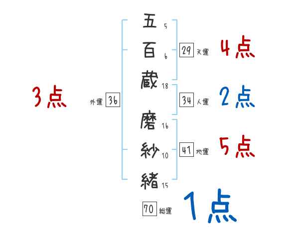 天運![]() | 五百蔵磨紗緒さんの天運は29画の4つ星!完全主義で才能がある。厳格な心の持ち主。 家系が持つ宿命的な運勢を表します。祖先から受け継いだ苗字ですので自分の力が及びません。家柄を象徴します。 |