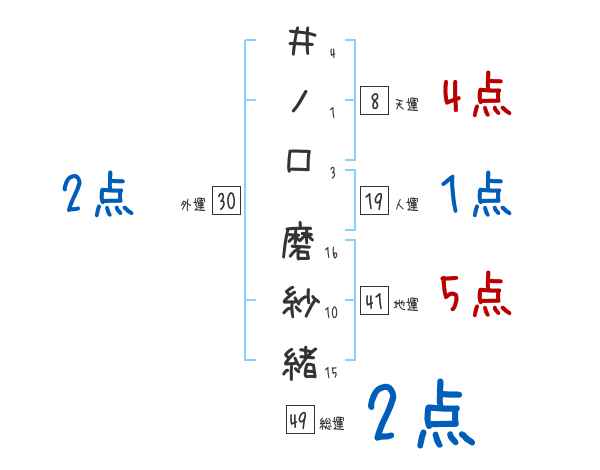 総運![]() | 井ノ口磨紗緒さんの総運は49画の2つ星!不安定な性格で明暗がある人生。周りの人には支援されやすい。 あなたの人生を表す1番重要な運勢です。生涯を通じて影響する総合運となり、主に50歳以降の晩年期に影響を及ぼします。 |