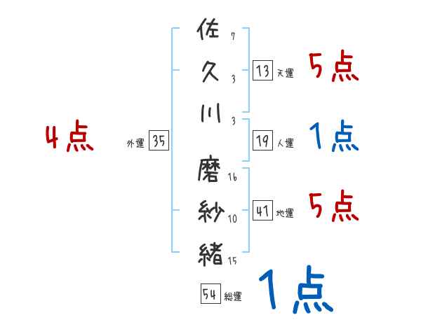 外運![]() | 佐久川磨紗緒さんの外運は35画の4つ星!温厚な性格で感受性が高い。穏和な性格で人望が厚い。 生活面を象徴する運勢です。外部から受ける影響力を表し、結婚運、家庭運や職場、環境への順応性を表します。 |