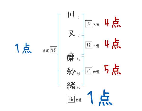 天運![]() | 川又磨紗緒さんの天運は5画の4つ星!健康で安泰。協調性に優れ、財産に恵まれる。 家系が持つ宿命的な運勢を表します。祖先から受け継いだ苗字ですので自分の力が及びません。家柄を象徴します。 |